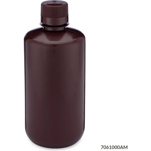 Bottle, Narrow Mouth, HDPE Bottle, Attached Polypropylene Screw Cap, Amber, 1000mL, 6/Pack