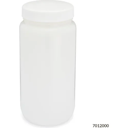 Bottle, Wide Mouth, HDPE Bottle, Attached Polypropylene Screw Cap, 2 Liters (0.5 Gallons)