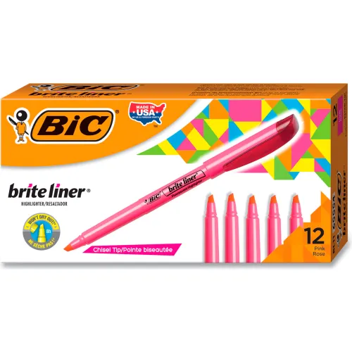 Bic® Brite Liner Highlighter with Pocket Clip, Chisel Tip, Pink Ink, Dozen