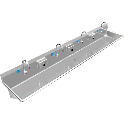 BSM Inc. ADA SS Sink, 4 Station with Electronic Faucet, Wall Mount, 108"L x 20"W x 6"D Sink