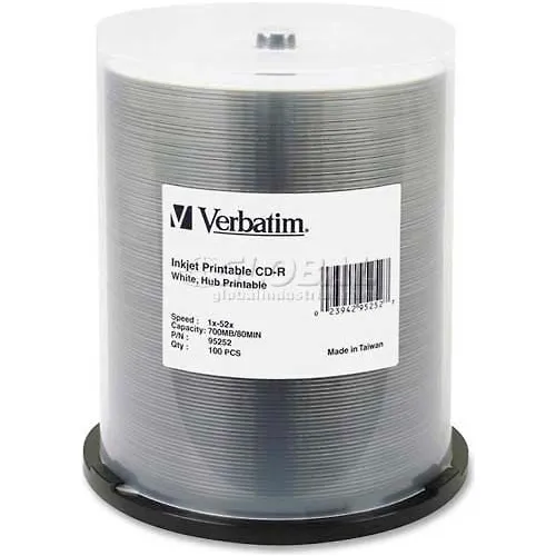 Verbatim® CD-R Discs, 95252, 52X, 700MB/80Min, Inkjet/Hub Printable, Spindle, 100/Pk, White