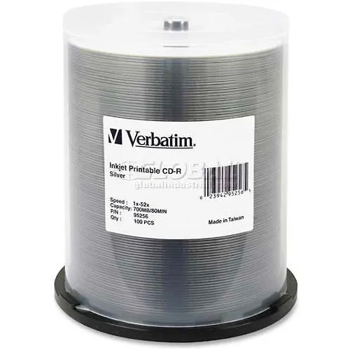 Verbatim® CD-R Discs, 95256, 52X, 700MB/80Min, Inkjet Printable, Spindle, 100/Pk, Silver