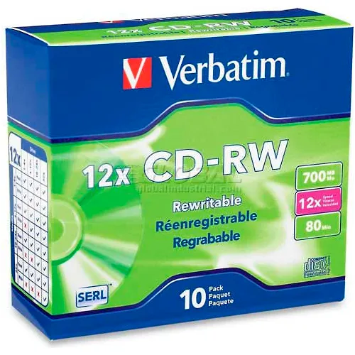 Verbatim® CD-RW Discs, 95156, 4-12X, 700MB/80Min, Slim Case, 10/Pk, Silver