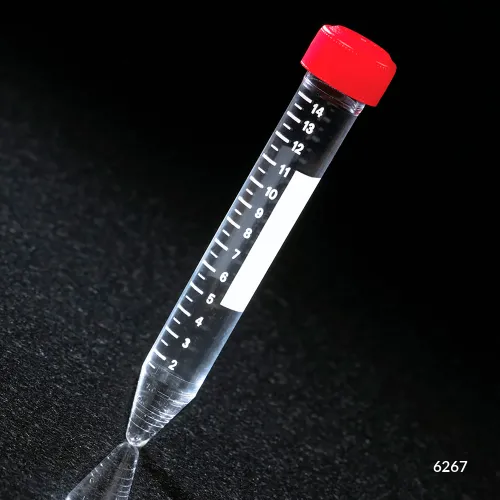 Centrifuge Tube, 15mL, Attached Red Screw Cap, Polystyrene, Sterile, 500/Pack