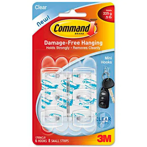 Command Mini Clear Hooks, Plastic, Supports 0.5 lb, 6/Pack
