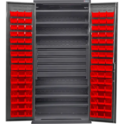 Global Industrial™ Configurable Drawer Cabinet, 36"Wx24"Dx78"H, 6 Shelves, 4 Drawers, 96 Red Bins
