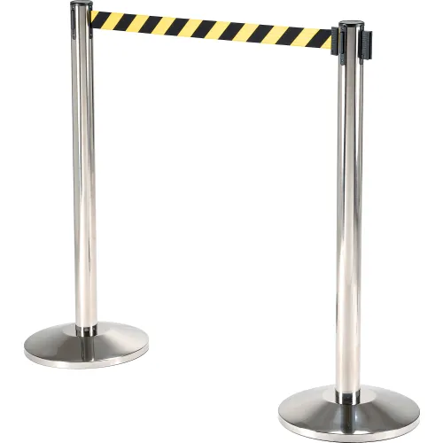 Global Industrial Retractable Belt Barrier, 40" Stainless Steel Post, 10' Black/Yellow Belt - Pkg Qty 2