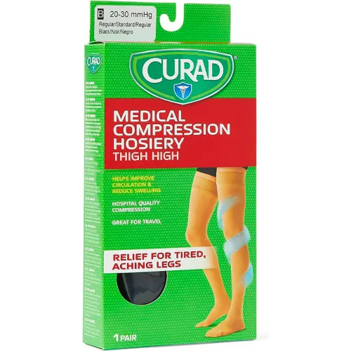Medline Curad Compression Hosiery w/ 20-30 mmHg, Thigh High, Medium, Size B, Black
