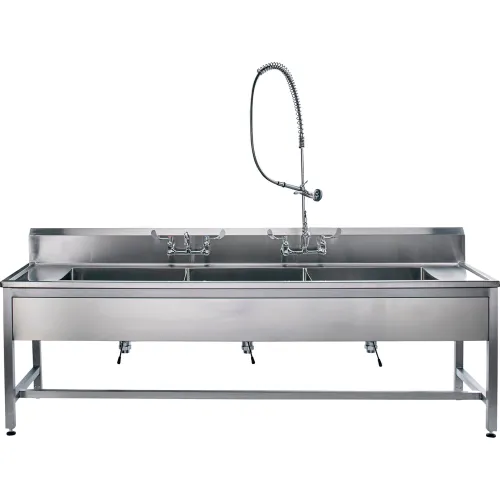 Blickman Decontamination Station, 116"W X 30"D, Stationary Legs, 3 Sink Bowls, Deck Mounted Faucets