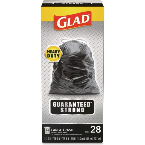 Glad® Guaranteed Strong Large Drawstring Black Trash Bags, 3-Ply, 30gal, 1.05 mil, 30x33, 28/BX