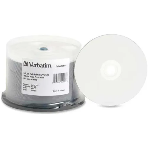 Verbatim® DVD+R, 94917, 16X Speed, 4.7GB, Inkjet/Hub Printable, 50/Pk