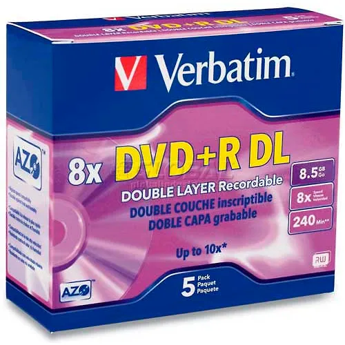 Verbatim® DVD+R, 95311, 8X Speed, 8.5GB, W/Jewel Case, Double Layer, Branded, 5/Pk