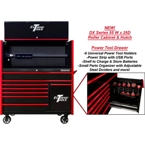 Extreme Tools DX Power Workstation Hutch & Roller Cabinet, 54-5/8"W x 25"D x 64-3/4"H, Blue/Blk Trim
