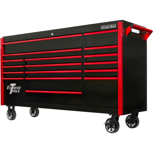 Extreme Tools DX722117RCBKRD 72"W x 21"D 17 Drawer Black W/Red Pulls Triple Bank Roller Cabinet