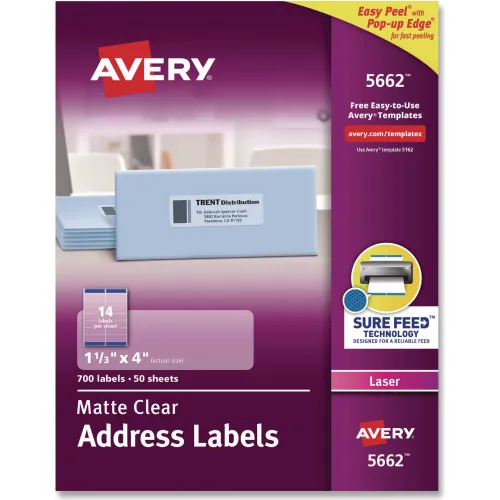 Avery® Easy Peel Laser Mailing Labels, 1-1/3 x 4, Clear, 700/Box