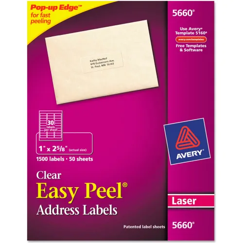 Avery® Easy Peel Laser Mailing Labels, 1 x 2-5/8, Clear, 1500/Box