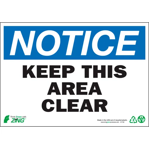 Zing Eco Safety Sign, Notice Keep Area Clear, 10"W x 7"H, Recycled Aluminum