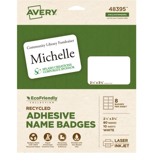 Avery® EcoFriendly Name Badge Labels, 2-1/3" x 3-3/8, White, 80/Pack