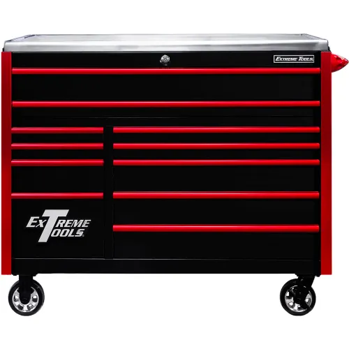 Extreme Tools EXQ Pro Roller Cabinet, 55"W x 30"D x 46-5/8"H, Black with Red Drawer Pulls & Trim