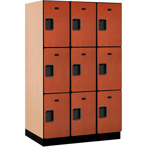 Salsbury 3-Tier 9 Door Extra Wide Wood Locker, 45"W x 24"D x 76"H, Cherry, Partially Assembled