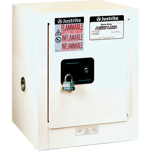 Justrite® Flammable Cabinet, Self Close Single Door, 4 Gallon Cap., 17"W x 17"D x 22"H, White