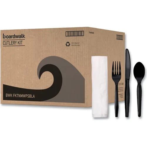 Boardwalk® Four Piece Fork/Knife/Napkin/Teaspoon Cutlery Kit, Black, Pack of 250