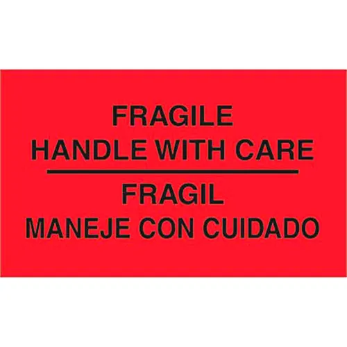 "Fragile Handle w/ Care" Print Bilingual Labels, 5"L x 3"W, Fluorescent Red, Roll of 500
