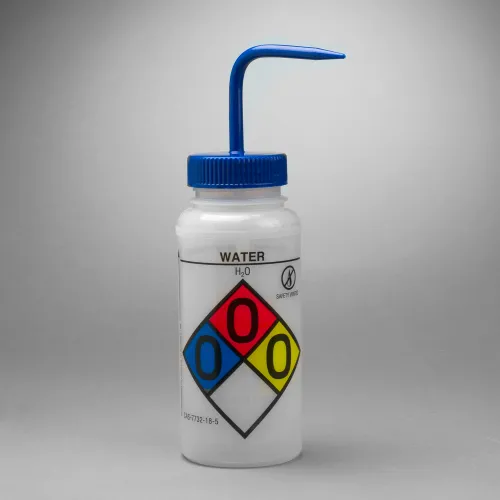 Bel-Art GHS Labeled Safety-Vented Water Wash Bottles, 500ml (16oz), Polyethylene w/Blue PP Cap 4Pk