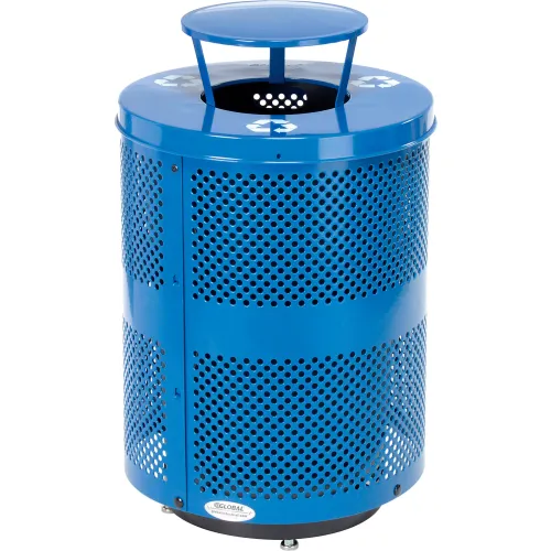 Global Industrial Outdoor Perforated Steel Recycling Can W/Rain Bonnet Lid & Base, 36Gal, Blue