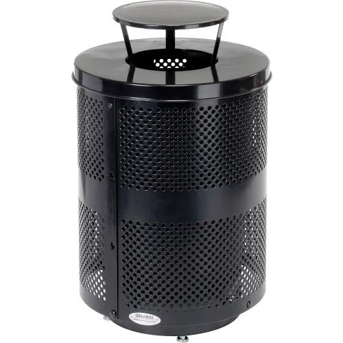 Global Industrial Outdoor Perforated Steel Trash Can W/Rain Bonnet Lid & Base, 36 Gallon,Black