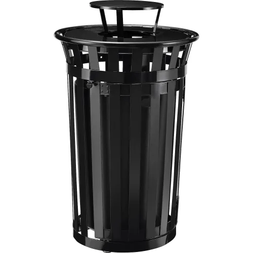 Global Industrial Outdoor Slatted Steel Trash Can W/Access Door & Rain Bonnet Lid,36 Gal,Black