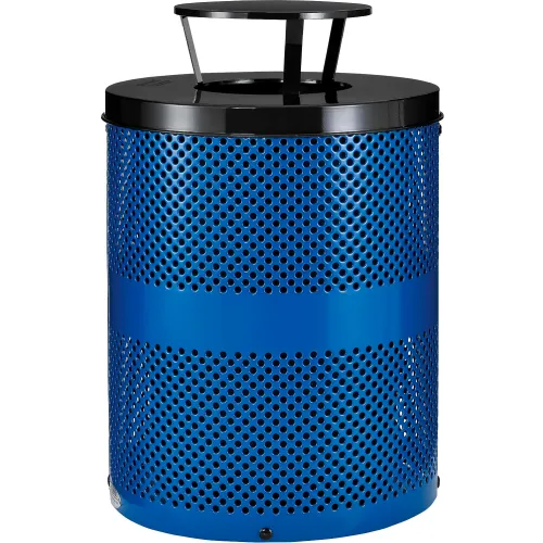Global Industrial Outdoor Perforated Steel Trash Can With Rain Bonnet Lid, 36 Gallon, Blue