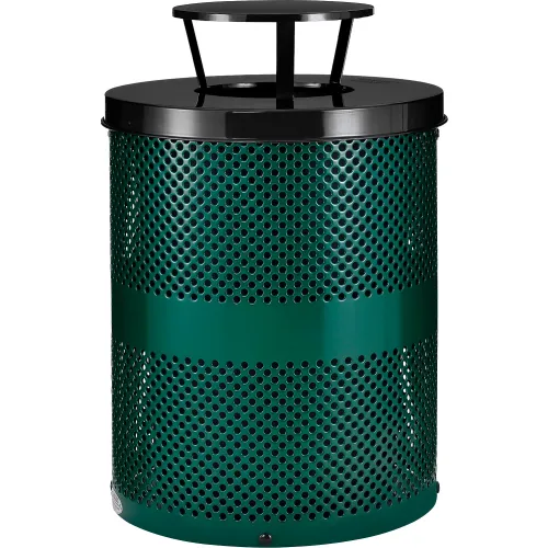 Global Industrial Outdoor Perforated Steel Trash Can With Rain Bonnet Lid, 36 Gallon, Green