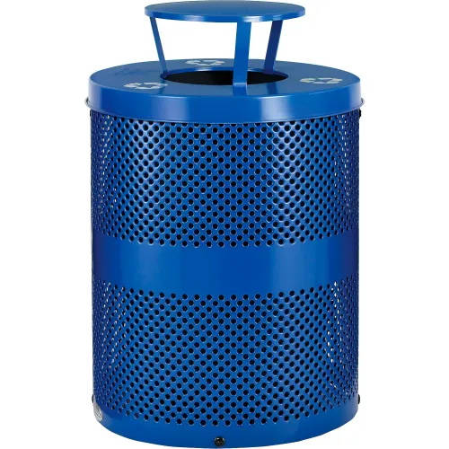 Global Industrial Outdoor Perforated Steel Recycling Can w/Rain Bonnet Lid, 36 Gallon, Blue