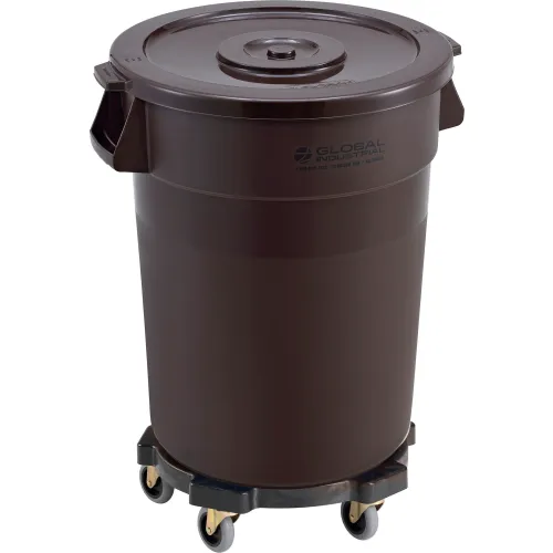 Global Industrial Plastic Trash Can with Lid & Dolly - 32 Gallon Brown