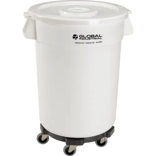 Global Industrial Plastic Trash Can with Lid & Dolly - 32 Gallon White