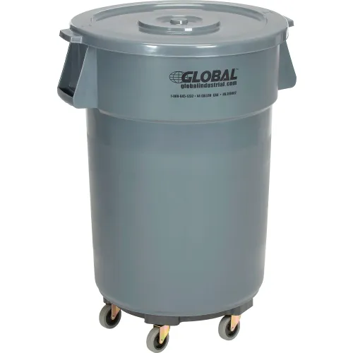 Global Industrial Plastic Trash Can with Lid & Dolly - 44 Gallon Gray