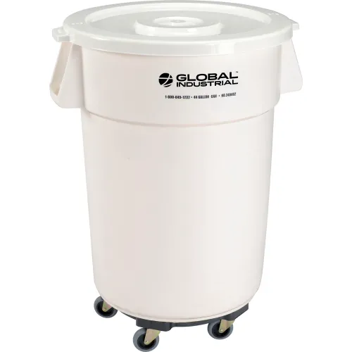Global Industrial Plastic Trash Can with Lid & Dolly - 44 Gallon White