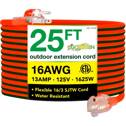 GoGreen Power, GG-13725, 25 Ft 16/3 SJTW Outdoor Extension Cord, Orange w/ Lighted Green Ends
