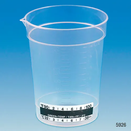 Graduated Specimen Container With Pour Spout, 6.5 oz., Thermometer Strip, Polypropylene, 500/Pack