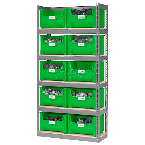 Global Industrial Steel Boltless Wood Deck Shelving - 10 Plastic Hopper Bins Green, 42x15x84