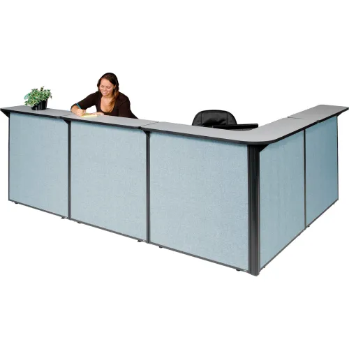 Interion® L-Shaped Reception Station, 116"W x 80"D x 44"H, Gray Counter, Blue Panel