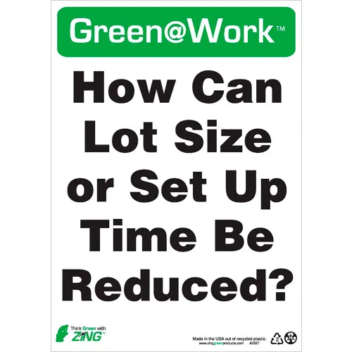 Zing Green at Work Sign, How Can Lot Size or Set Up Time Be Reduced, 10"W x 14"H, Black/Green/White