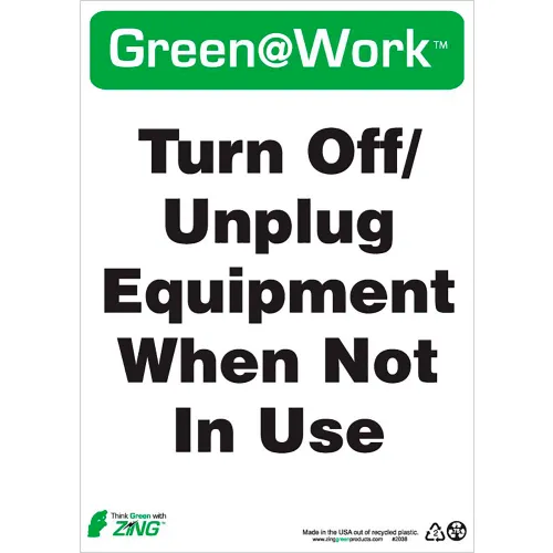 Zing Green at Work Sign, Turn Off, Unplug Equipment When Not In Use, 10"W x 14"H, Black/Green/White