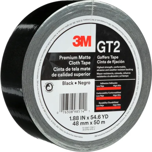 3M GT2 Premium Matte Cloth Gaffers Tape, 1-7/8" x 54-11/16 Yds., 11 Mil, Black - Pkg Qty 24