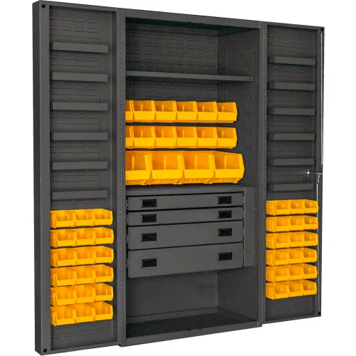 Durham Mfg.® HD Cabinet, 14 Ga., 1 Fixed Shelf, 36"W x 24"D x 72"H, 52 Yellow Bins, Gray