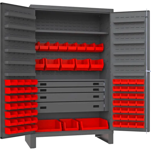 Durham Mfg.® HD Cabinet, 14 Ga., 1 Fixed Shelf, 48"W x 24"D x 78"H, 72 Red Bins, Gray