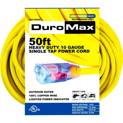 DuroMax Heavy Duty Single Tap Extension Power Cord, SJTW, 10 Gauge, 15A, 120V, 50'L, Yellow
