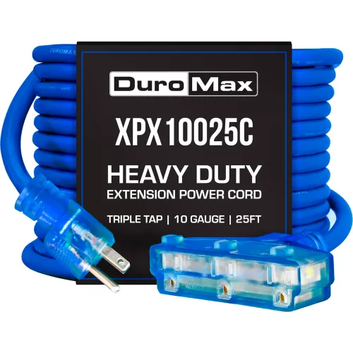 DuroMax Heavy Duty Triple Tap Extension Power Cord, SJEOOW, 10 Gauge, 15A, 120V, 25'L, Blue