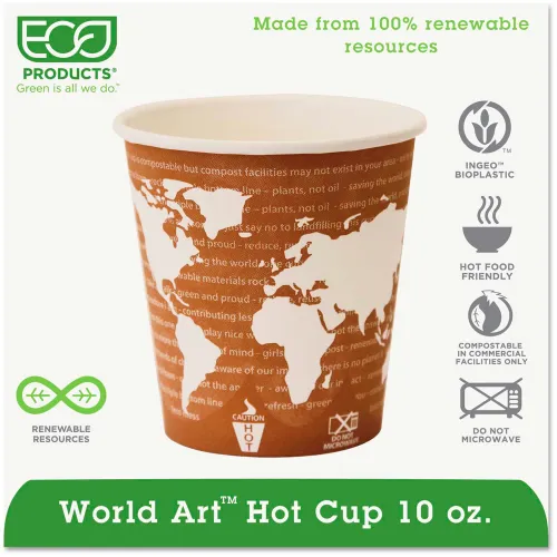 Eco-Products® Hot Paper Cups, World Art, 10 Oz. Plant-Based Resin Inner Lining